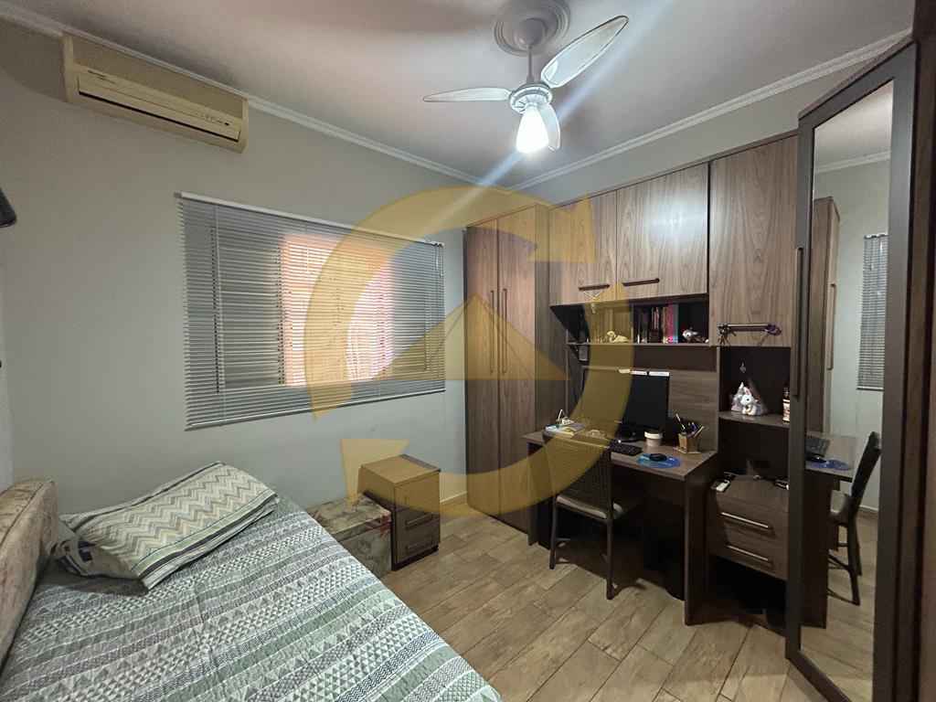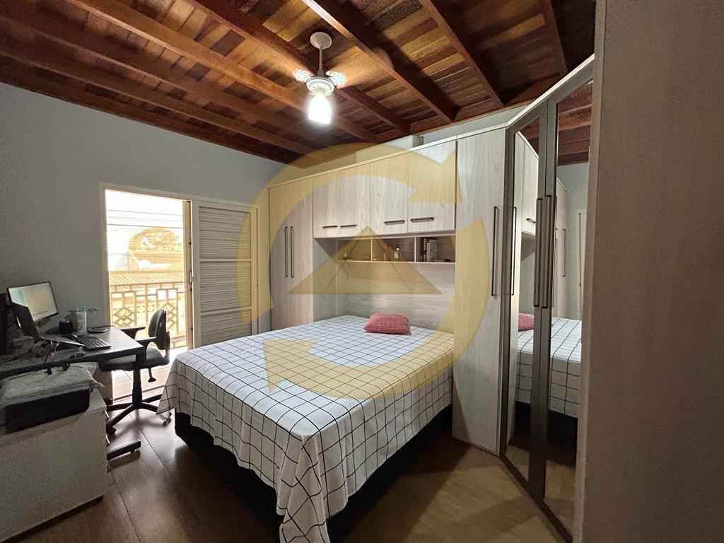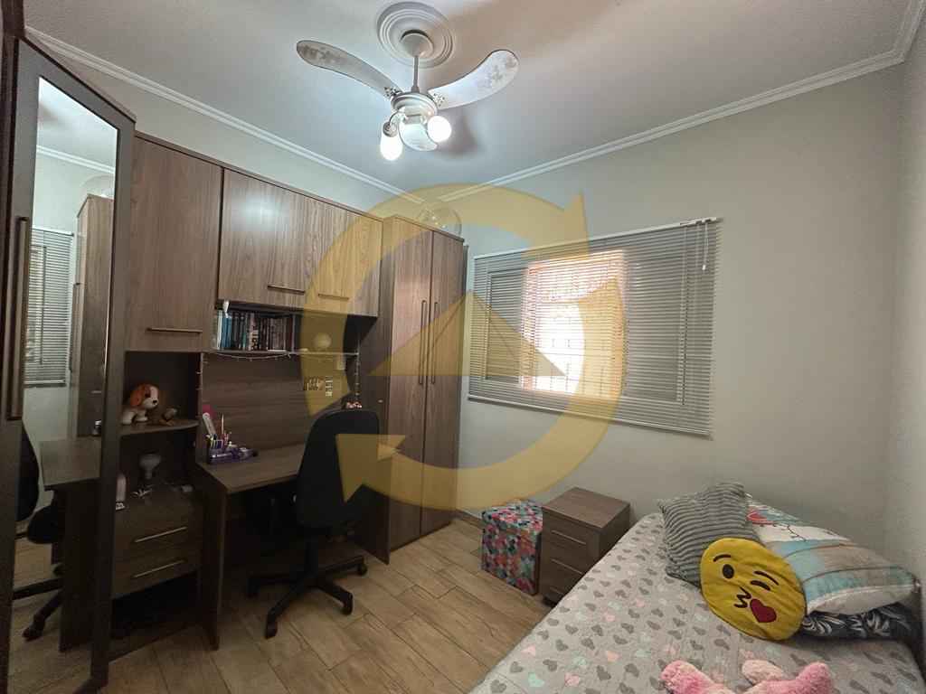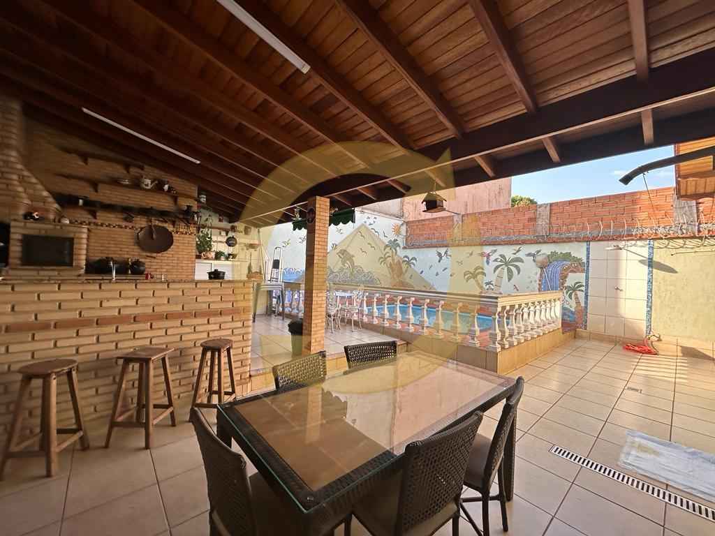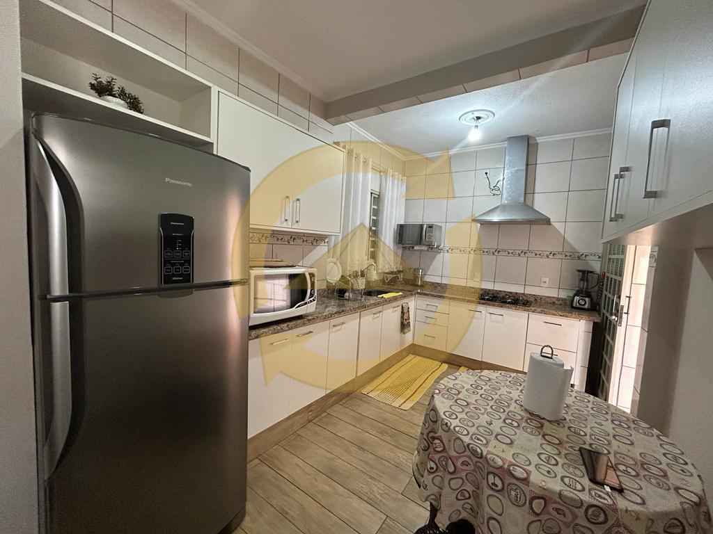 Sobrado: 03 dormitórios (sendo uma suíte), armários, sala, copa, cozinha c/armários, 02 wc social (sendo 01 externo), sacada, escada, piso frio, lavanderia, quintal, área de churrasco, piscina, garagem 04 vagas e portão eletrônico.